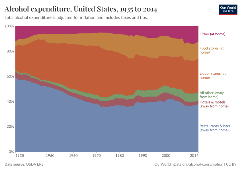 This shows the expenditure on alcohol in the United States, differentiated by where the alcohol has been purchased and consumed.