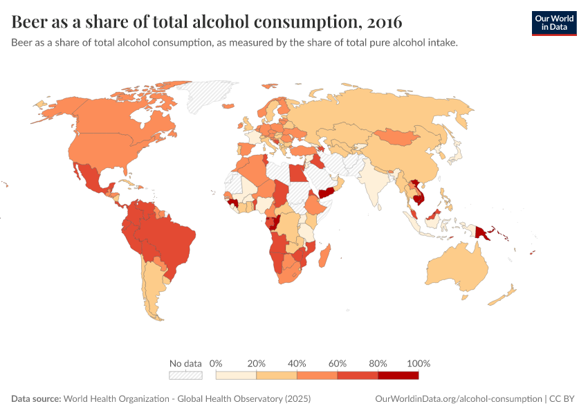 The first map shows this in terms of spirits as a share of total alcohol consumption. In many Asian countries, spirits account for most of total alcohol consumption.