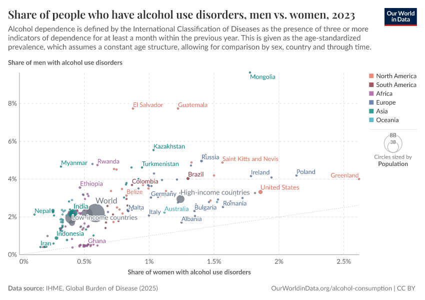 The scatter plot compares the prevalence of alcohol use disorders in males versus that of females. The prevalence of alcohol dependence in men is typically higher than in women across all countries.