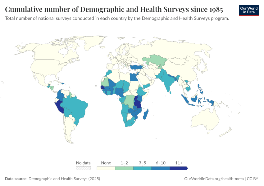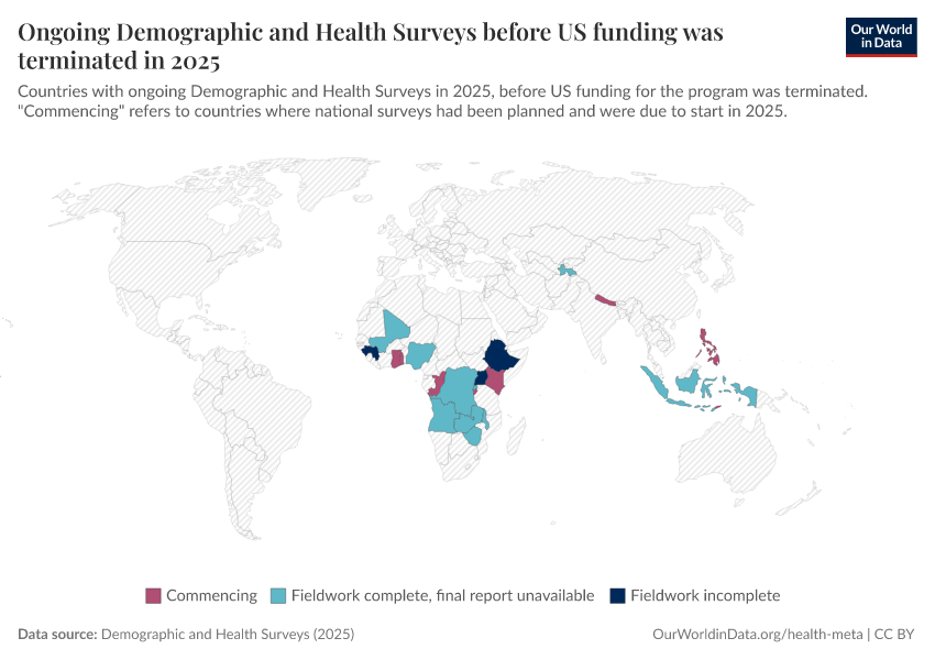Saloni Dattani (2025) - “The Demographic and Health Surveys brought crucial data for more than 90 countries — without them, we risk darkness” Published online at OurWorldinData.org. Retrieved from: 'https://chart-preview-staging.owid.pages.dev:8789/20260217-063335/demographic-health-surveys-risk.html' [Online Resource] (archived on February 17, 2026).BibTeX citation
