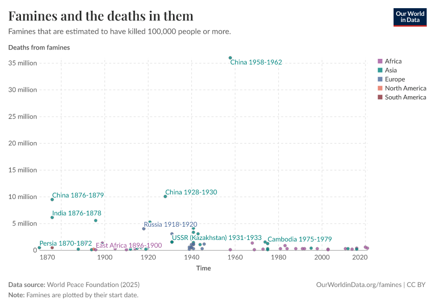 The chart is from Our World in Data. The data source is the World Peace Foundation's Historic Famines Dataset.