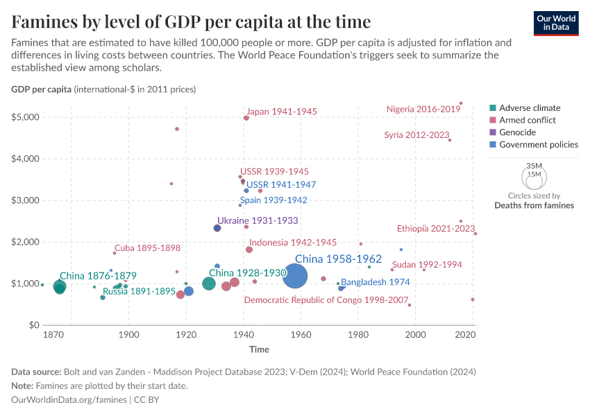 Our source, the World Peace Foundation, also identifies a main trigger for each famine. This data suggests that all famines in the slightly richer countries were not triggered by adverse climates, but human action in the form of bad government policies or armed conflict.