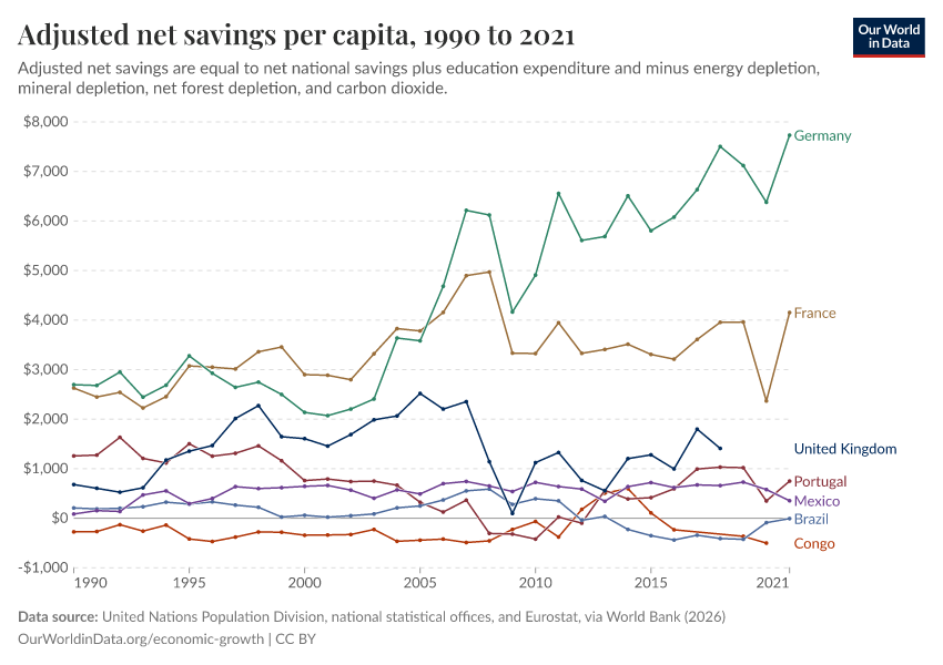 “Data Page: Adjusted net savings per capita”. Our World in Data (2026). Data adapted from United Nations Population Division, national statistical offices, and Eurostat, via World Bank. Retrieved from https://chart-preview-staging.owid.pages.dev:8789/20260202-181317/grapher/adjusted-net-savings-per-person.html [online resource] (archived on February 2, 2026).How to cite this data