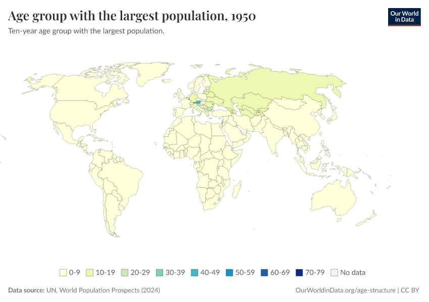 “Data Page: Ten year age-group with the highest population”. Our World in Data (2026). Data adapted from United Nations. Retrieved from https://chart-preview-staging.owid.pages.dev:8789/20251002-121819/grapher/age-group-with-the-largest-population.html [online resource] (archived on October 2, 2025).How to cite this data