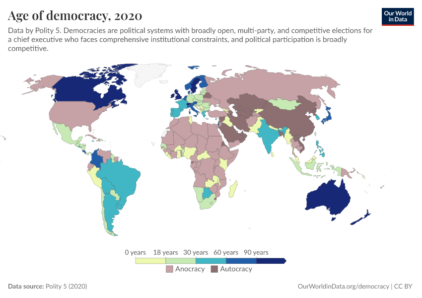 Polity 5 (2020) – processed by Our World in Data. “Age of democracy” [dataset]. Polity 5, “Polity5 Project, Political Regime Characteristics and Transitions, 1800-2018 5” [original data]. Retrieved February 23, 2026 from https://chart-preview-staging.owid.pages.dev:8789/20250909-093708/grapher/age-of-democracy-polity.html (archived on September 9, 2025).