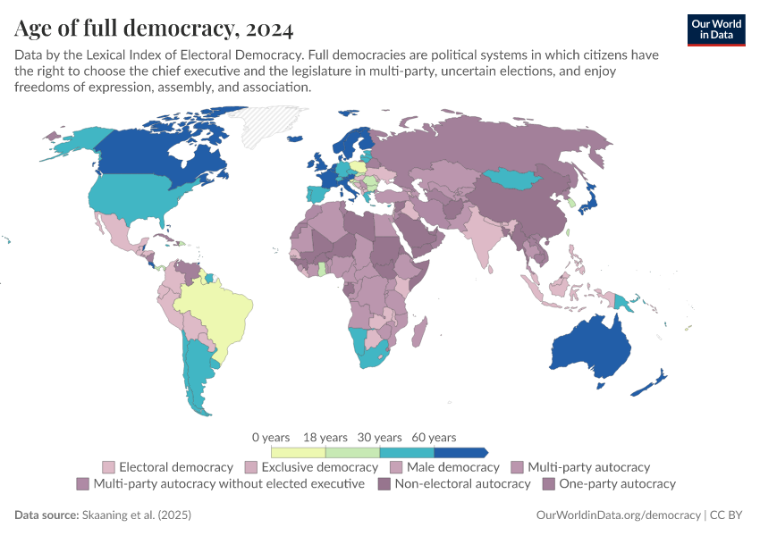 Skaaning et al. (2025) – processed by Our World in Data. “Age of full democracy” [dataset]. Skaaning et al., “Lexical Index of Electoral Democracy (LIED) v6.8” [original data]. Retrieved February 23, 2026 from https://chart-preview-staging.owid.pages.dev:8789/20260119-065148/grapher/age-of-full-democracy.html (archived on January 19, 2026).