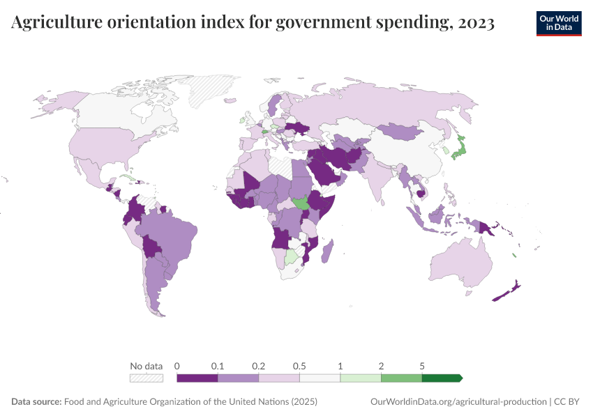 Food and Agriculture Organization of the United Nations (2024) – with major processing by Our World in Data. “Agriculture orientation index for government spending – UN FAO” [dataset]. Food and Agriculture Organization of the United Nations, “Investment: Country Investment Statistics Profile” [original data]. Retrieved February 23, 2026 from https://chart-preview-staging.owid.pages.dev:8789/20250909-093708/grapher/agriculture-orientation-index.html (archived on September 9, 2025).