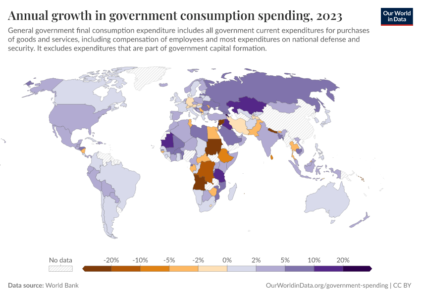 “Data Page: Annual growth in government consumption spending”. Our World in Data (2026). Data adapted from World Bank. Retrieved from https://chart-preview-staging.owid.pages.dev:8789/20260130-180113/grapher/annual-growth-of-general-government-final-consumption-expenditure.html [online resource] (archived on January 30, 2026).How to cite this data