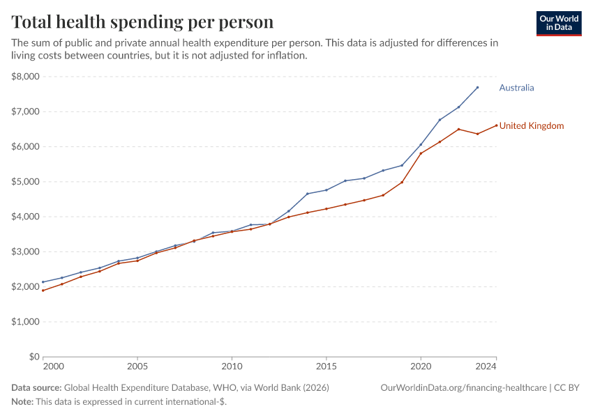 “Data Page: Total health spending per person”. Our World in Data (2026). Data adapted from Global Health Expenditure Database, WHO, via World Bank. Retrieved from https://chart-preview-staging.owid.pages.dev:8789/20260202-180243/grapher/annual-healthcare-expenditure-per-capita.html [online resource] (archived on February 2, 2026).