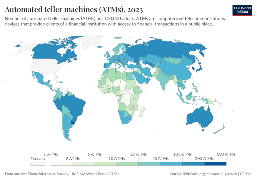 “Data Page: Automated teller machines (ATMs)”. Our World in Data (2026). Data adapted from Financial Access Survey - IMF, via World Bank. Retrieved from https://chart-preview-staging.owid.pages.dev:8789/20260202-181317/grapher/automated-teller-machines-atms-per-100000-adults.html [online resource] (archived on February 2, 2026).How to cite this data