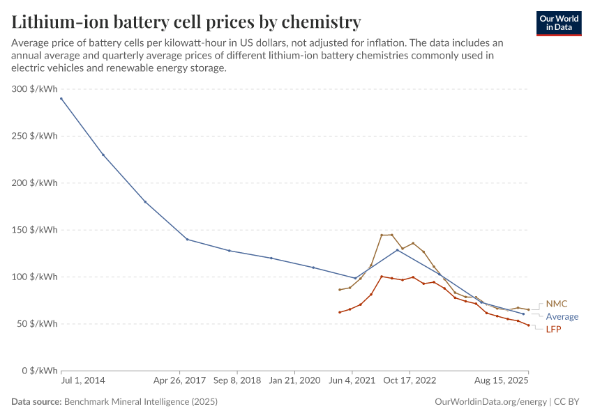 Benchmark Mineral Intelligence (2025) – with minor processing by Our World in Data. “Lithium-ion battery cell prices by chemistry” [dataset]. Benchmark Mineral Intelligence, “Lithium-ion battery prices”; Benchmark Mineral Intelligence, “Battery prices by chemistry” [original data]. Retrieved February 23, 2026 from https://chart-preview-staging.owid.pages.dev:8789/20260108-171008/grapher/average-battery-cell-price.html (archived on January 8, 2026).