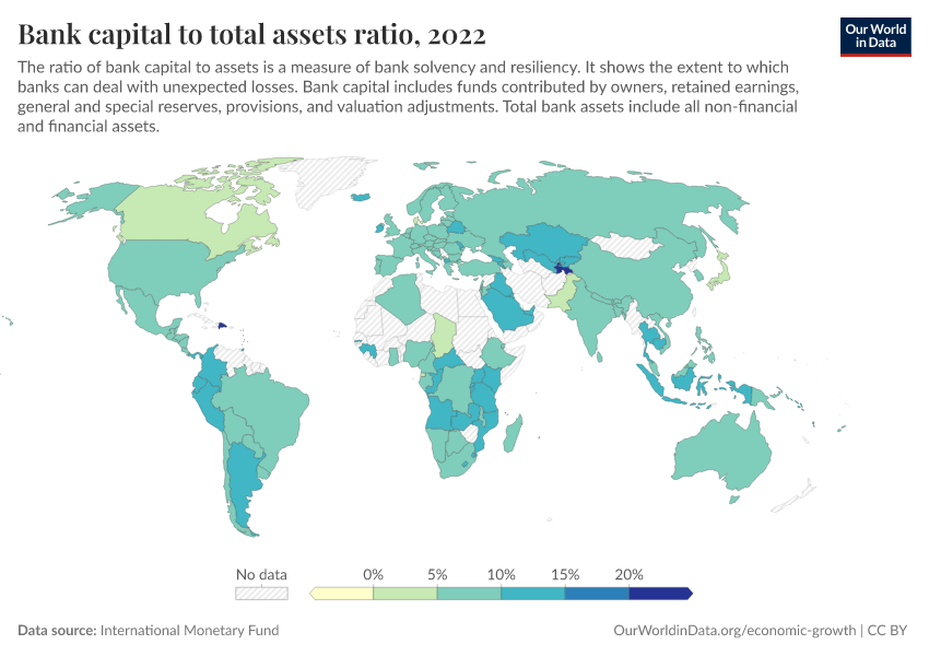 “Data Page: Bank capital to total assets ratio”. Our World in Data (2026). Data adapted from International Monetary Fund. Retrieved from https://chart-preview-staging.owid.pages.dev:8789/20251120-211749/grapher/bank-capital-to-total-assets-ratio.html [online resource] (archived on November 20, 2025).How to cite this data