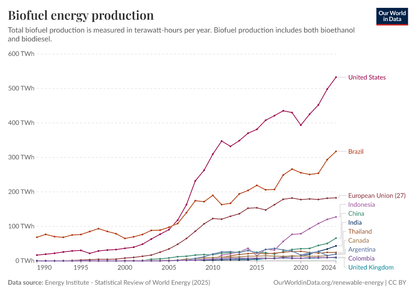 Energy Institute - Statistical Review of World Energy (2025) – with major processing by Our World in Data. “Biofuels production” [dataset]. Energy Institute, “Statistical Review of World Energy” [original data]. Retrieved February 23, 2026 from https://chart-preview-staging.owid.pages.dev:8789/20260119-065148/grapher/biofuel-production.html (archived on January 19, 2026).