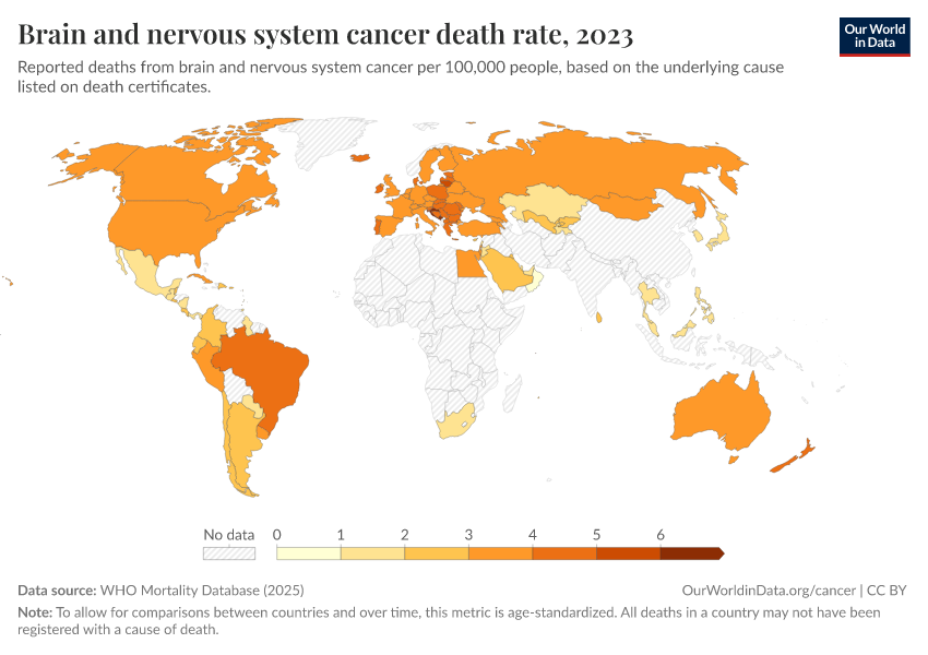 WHO Mortality Database (2025) – with minor processing by Our World in Data. “Brain and nervous system cancer death rate” [dataset]. WHO Mortality Database, “WHO Mortality Database” [original data]. Retrieved February 23, 2026 from https://chart-preview-staging.owid.pages.dev:8789/20250909-093708/grapher/brain-and-nervous-system-cancer-death-rate.html (archived on September 9, 2025).