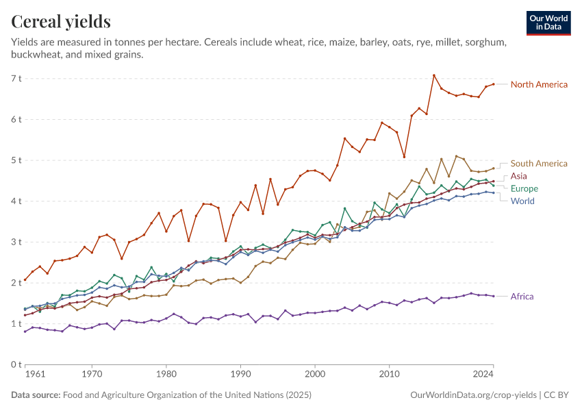 Food and Agriculture Organization of the United Nations (2025) – with major processing by Our World in Data. “Cereal yields – UN FAO” [dataset]. Food and Agriculture Organization of the United Nations, “Production: Crops and livestock products” [original data]. Retrieved February 23, 2026 from https://chart-preview-staging.owid.pages.dev:8789/20260116-143329/grapher/cereal-yield.html (archived on January 16, 2026).