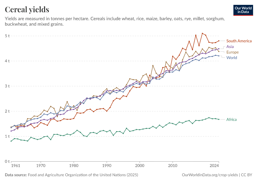 Food and Agriculture Organization of the United Nations (2025) – with major processing by Our World in Data. “Cereal yields – UN FAO” [dataset]. Food and Agriculture Organization of the United Nations, “Production: Crops and livestock products” [original data]. Retrieved February 23, 2026 from https://chart-preview-staging.owid.pages.dev:8789/20260116-143329/grapher/cereal-yield.html (archived on January 16, 2026).