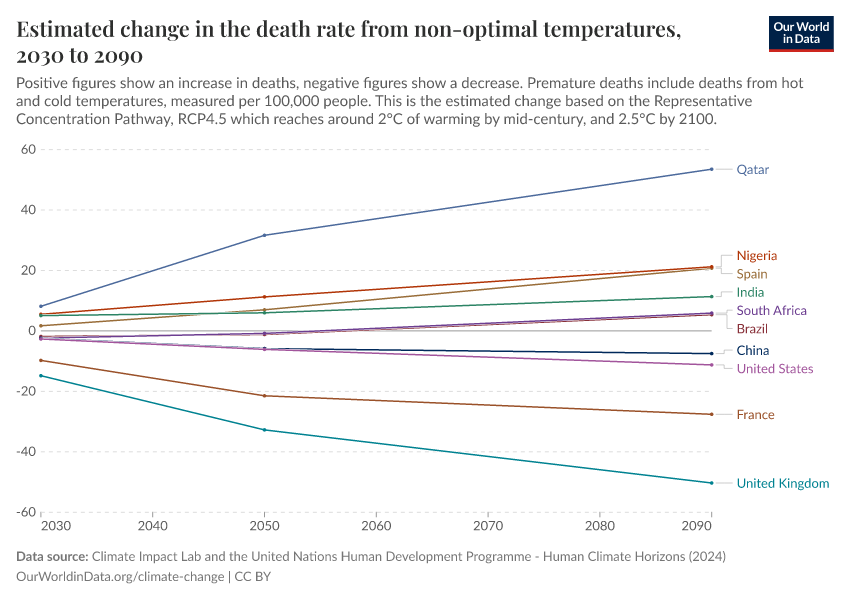 “Data Page: Estimated change in the death rate from non-optimal temperatures”. Our World in Data (2026). Data adapted from Climate Impact Lab and the United Nations Human Development Programme. Retrieved from https://chart-preview-staging.owid.pages.dev:8789/20250909-093708/grapher/change-heat-death-rate.html [online resource] (archived on September 9, 2025).How to cite this data