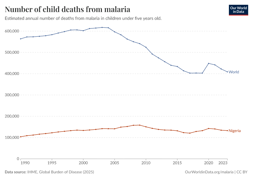 IHME, Global Burden of Disease (2025) – with major processing by Our World in Data. “Number of child deaths from malaria” [dataset]. IHME, Global Burden of Disease, “Global Burden of Disease - Deaths” [original data]. Retrieved February 23, 2026 from https://chart-preview-staging.owid.pages.dev:8789/20260211-174736/grapher/child-deaths-from-malaria-number.html (archived on February 11, 2026).