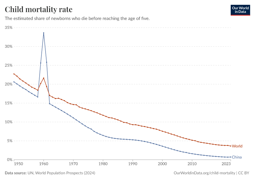 “Data Page: Child mortality rate, ages 0-4”. Our World in Data (2026). Data adapted from United Nations. Retrieved from https://chart-preview-staging.owid.pages.dev:8789/20250925-232706/grapher/child-mortality-around-the-world.html [online resource] (archived on September 25, 2025).How to cite this data