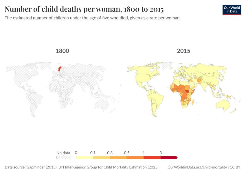 Gapminder (2015); UN Inter-agency Group for Child Mortality Estimation (2025) – processed by Our World in Data. “Child mortality rate – Gapminder; UN IGME – Long-run data” [dataset]. United Nations Inter-agency Group for Child Mortality Estimation, “United Nations Inter-agency Group for Child Mortality Estimation”; Gapminder, “Child mortality rate under age five v7”; Gapminder based on UN IGME & UN WPP, “Under-five Mortality v11”; United Nations, “World Population Prospects”; Gapminder, “Babies per woman (total fertility rate) v12”; Various sources, “Population” [original data]. Retrieved February 23, 2026 from https://chart-preview-staging.owid.pages.dev:8789/20260119-070102/grapher/children-died-before-five-per-woman.html (archived on January 19, 2026).