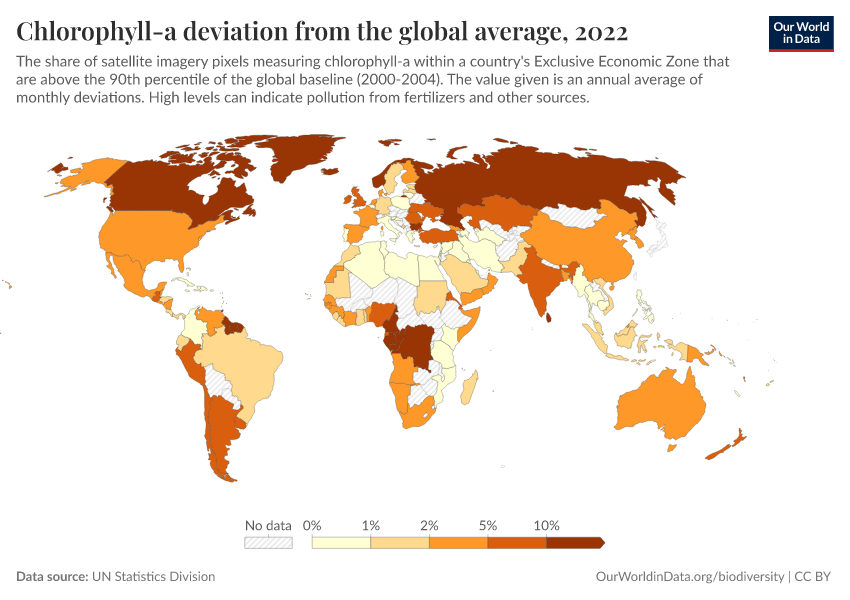 “Data Page: Chlorophyll-a deviation from the global average”. Our World in Data (2026). Data adapted from UN Statistics Division. Retrieved from https://chart-preview-staging.owid.pages.dev:8789/20260130-180113/grapher/chlorophyll-a-deviation-from-the-global-average.html [online resource] (archived on January 30, 2026).How to cite this data