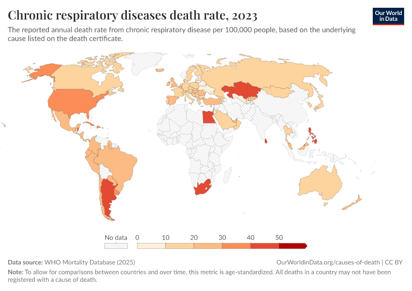 “Data Page: Chronic respiratory diseases death rate”, part of the following publication: Saloni Dattani, Fiona Spooner, Hannah Ritchie, and Max Roser (2023) - “Causes of Death”. Data adapted from WHO Mortality Database. Retrieved from https://chart-preview-staging.owid.pages.dev:8789/20250909-093708/grapher/chronic-respiratory-diseases-death-rate-who-mdb.html [online resource] (archived on September 9, 2025).How to cite this data