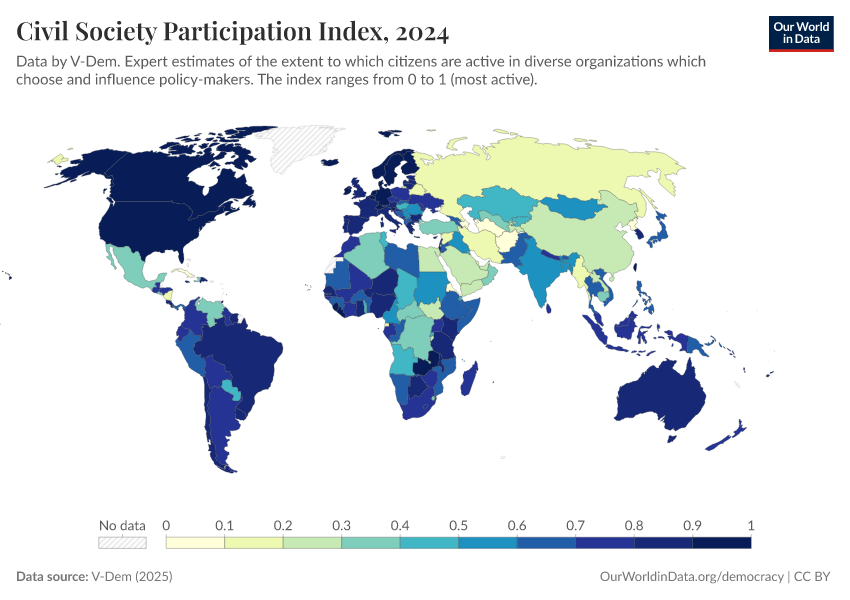 V-Dem (2025) – processed by Our World in Data. “Civil society participation index – V-Dem” [dataset]. V-Dem, “Democracy report v15” [original data]. Retrieved February 23, 2026 from https://chart-preview-staging.owid.pages.dev:8789/20260119-070102/grapher/civil-society-participation-index.html (archived on January 19, 2026).
