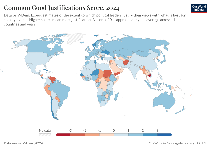 “Data Page: Common good justifications”, part of the following publication: Bastian Herre, Lucas Rodés-Guirao, and Esteban Ortiz-Ospina (2013) - “Democracy”. Data adapted from V-Dem. Retrieved from https://chart-preview-staging.owid.pages.dev:8789/20260204-170225/grapher/common-good-justifications-score.html [online resource] (archived on February 4, 2026).How to cite this data
