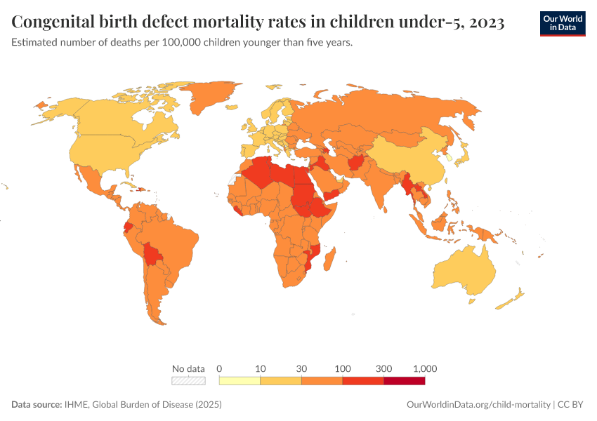IHME, Global Burden of Disease (2025) – with major processing by Our World in Data. “Congenital birth defect mortality rates in children under-5” [dataset]. IHME, Global Burden of Disease, “Global Burden of Disease - Deaths” [original data]. Retrieved February 23, 2026 from https://chart-preview-staging.owid.pages.dev:8789/20260211-174736/grapher/congenital-birth-defect-mortality-rates-in-children-under-5.html (archived on February 11, 2026).
