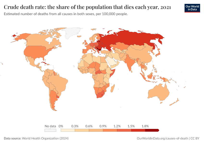 World Health Organization (2024) – with major processing by Our World in Data. “Crude death rate: the share of the population that dies each year” [dataset]. World Health Organization, “Global Health Estimates” [original data]. Retrieved February 23, 2026 from https://chart-preview-staging.owid.pages.dev:8789/20250909-093708/grapher/crude-death-rate-the-share-of-the-population-that-dies-each-year-who.html (archived on September 9, 2025).