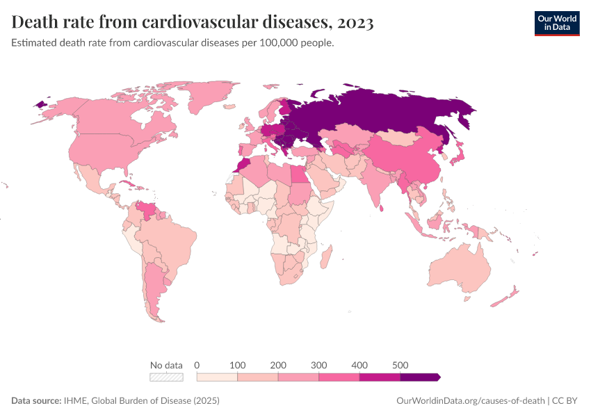 IHME, Global Burden of Disease (2025) – with major processing by Our World in Data. “Death rate from cardiovascular diseases” [dataset]. IHME, Global Burden of Disease, “Global Burden of Disease - Deaths” [original data]. Retrieved February 23, 2026 from https://chart-preview-staging.owid.pages.dev:8789/20260211-174736/grapher/death-rate-from-cardiovascular-diseases.html (archived on February 11, 2026).