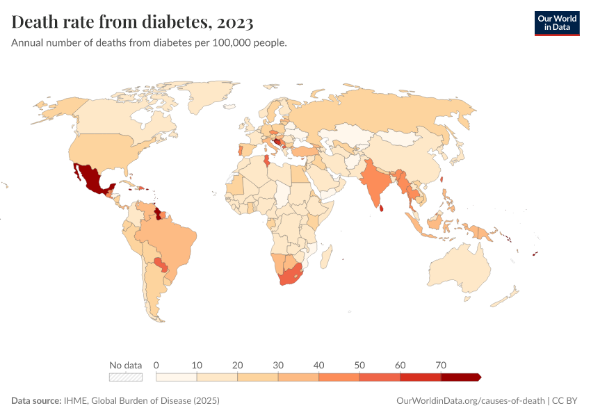 IHME, Global Burden of Disease (2025) – with major processing by Our World in Data. “Death rate from diabetes” [dataset]. IHME, Global Burden of Disease, “Global Burden of Disease - Deaths” [original data]. Retrieved February 23, 2026 from https://chart-preview-staging.owid.pages.dev:8789/20260211-174736/grapher/death-rate-from-diabetes-gbd.html (archived on February 11, 2026).