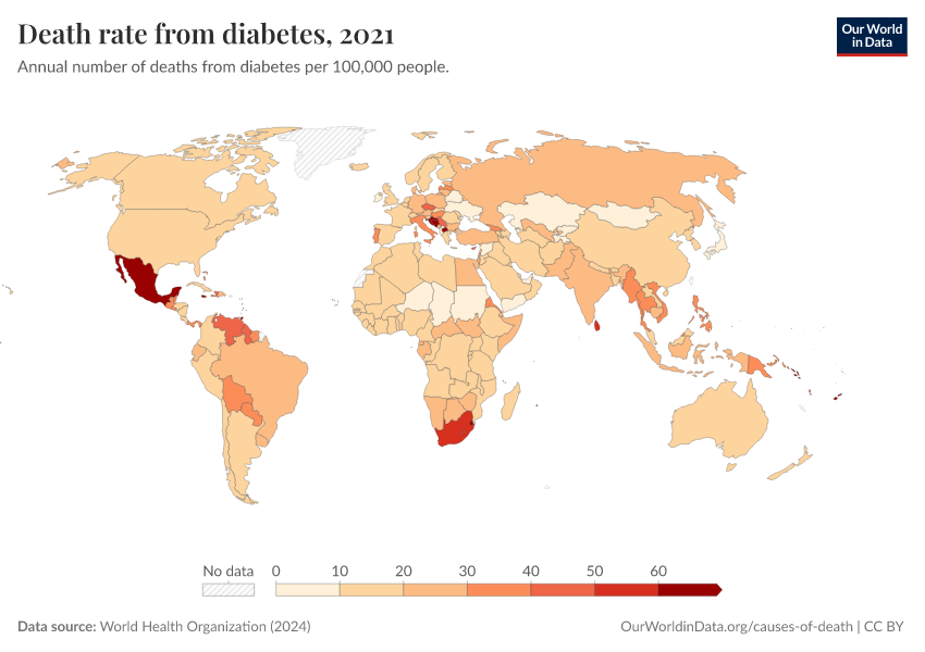 World Health Organization (2024) – with major processing by Our World in Data. “Death rate from diabetes” [dataset]. World Health Organization, “Global Health Estimates” [original data]. Retrieved February 23, 2026 from https://chart-preview-staging.owid.pages.dev:8789/20250909-093708/grapher/death-rate-from-diabetes-ghe.html (archived on September 9, 2025).