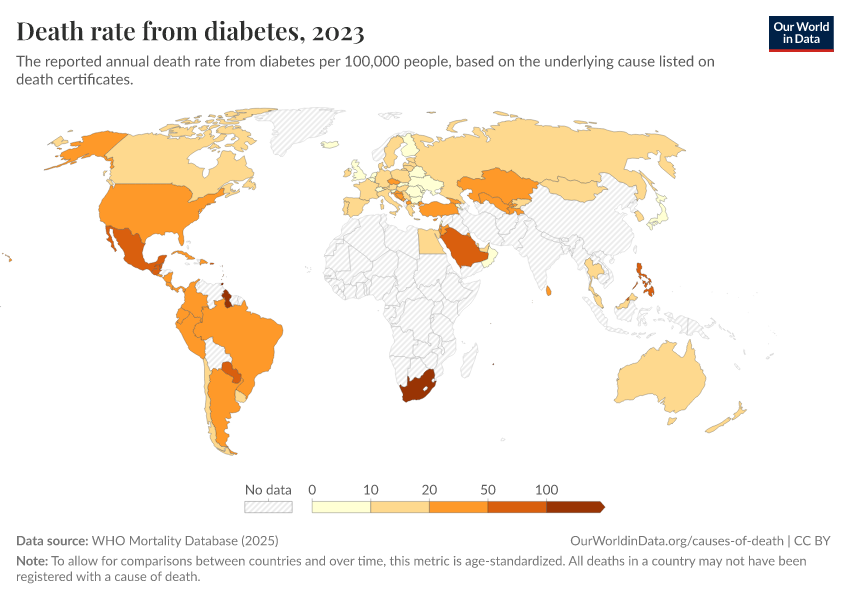 “Data Page: Death rate from diabetes”, part of the following publication: Saloni Dattani, Fiona Spooner, Hannah Ritchie, and Max Roser (2023) - “Causes of Death”. Data adapted from WHO Mortality Database. Retrieved from https://chart-preview-staging.owid.pages.dev:8789/20250909-093708/grapher/death-rate-from-diabetes-who-mdb.html [online resource] (archived on September 9, 2025).How to cite this data