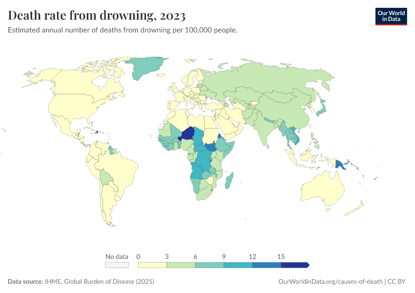 IHME, Global Burden of Disease (2025) – with major processing by Our World in Data. “Death rate from drowning” [dataset]. IHME, Global Burden of Disease, “Global Burden of Disease - Deaths” [original data]. Retrieved February 23, 2026 from https://chart-preview-staging.owid.pages.dev:8789/20260211-174736/grapher/death-rate-from-drowning.html (archived on February 11, 2026).