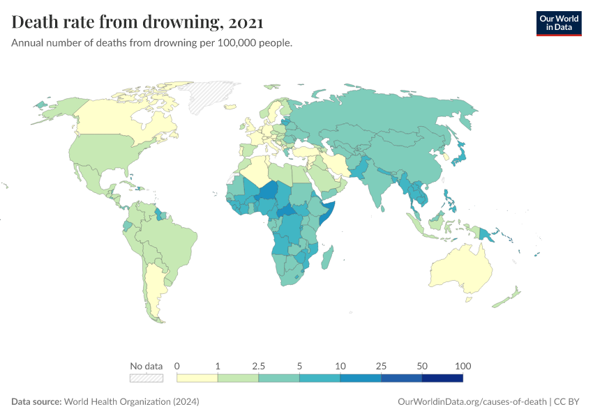 World Health Organization (2024) – with major processing by Our World in Data. “Death rate from drowning” [dataset]. World Health Organization, “Global Health Estimates” [original data]. Retrieved February 23, 2026 from https://chart-preview-staging.owid.pages.dev:8789/20250909-093708/grapher/death-rate-from-drowning-ghe.html (archived on September 9, 2025).