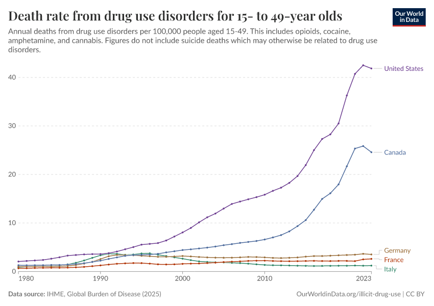 IHME, Global Burden of Disease (2025) – with major processing by Our World in Data. “Death rate from drug use disorders for 15- to 49-year olds” [dataset]. IHME, Global Burden of Disease, “Global Burden of Disease - Deaths” [original data]. Retrieved February 23, 2026 from https://chart-preview-staging.owid.pages.dev:8789/20260211-174736/grapher/death-rate-from-drug-use-disorders-for-15--to-49-year-olds.html (archived on February 11, 2026).