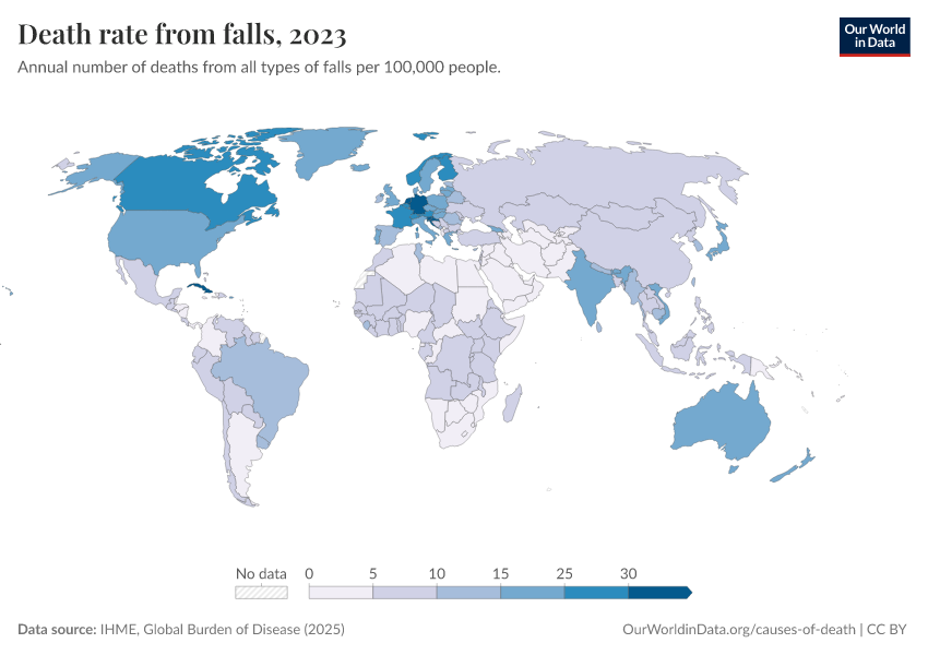 IHME, Global Burden of Disease (2025) – with major processing by Our World in Data. “Death rate from falls” [dataset]. IHME, Global Burden of Disease, “Global Burden of Disease - Deaths” [original data]. Retrieved February 23, 2026 from https://chart-preview-staging.owid.pages.dev:8789/20260211-174736/grapher/death-rate-from-falls-gbd-rate.html (archived on February 11, 2026).