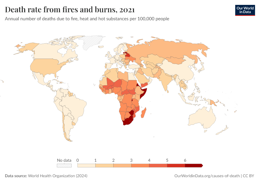 World Health Organization (2024) – with major processing by Our World in Data. “Death rate from fires and burns” [dataset]. World Health Organization, “Global Health Estimates” [original data]. Retrieved February 23, 2026 from https://chart-preview-staging.owid.pages.dev:8789/20250909-093708/grapher/death-rate-from-fires-and-burns-who.html (archived on September 9, 2025).
