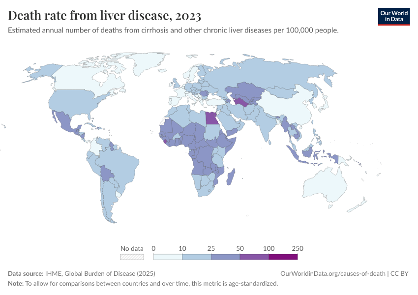 IHME, Global Burden of Disease (2025) – with major processing by Our World in Data. “Death rate from liver disease” [dataset]. IHME, Global Burden of Disease, “Global Burden of Disease - Deaths” [original data]. Retrieved February 23, 2026 from https://chart-preview-staging.owid.pages.dev:8789/20260211-174736/grapher/death-rate-from-liver-disease.html (archived on February 11, 2026).