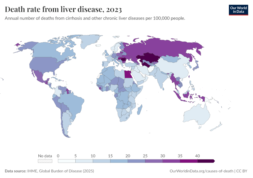 IHME, Global Burden of Disease (2025) – with major processing by Our World in Data. “Death rate from liver disease” [dataset]. IHME, Global Burden of Disease, “Global Burden of Disease - Deaths” [original data]. Retrieved February 23, 2026 from https://chart-preview-staging.owid.pages.dev:8789/20260211-174736/grapher/death-rate-from-liver-disease-gbd.html (archived on February 11, 2026).