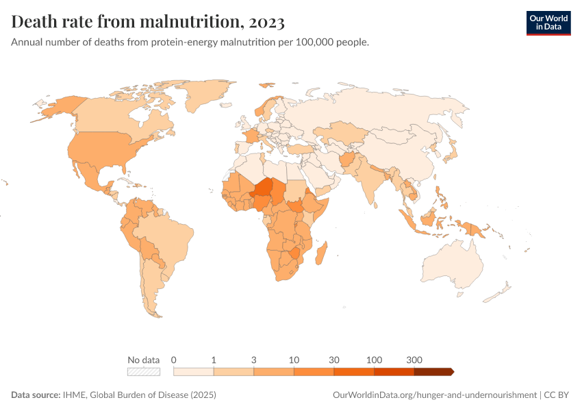 IHME, Global Burden of Disease (2025) – with major processing by Our World in Data. “Death rate from malnutrition” [dataset]. IHME, Global Burden of Disease, “Global Burden of Disease - Deaths” [original data]. Retrieved February 23, 2026 from https://chart-preview-staging.owid.pages.dev:8789/20260211-174736/grapher/death-rate-from-malnutrition.html (archived on February 11, 2026).