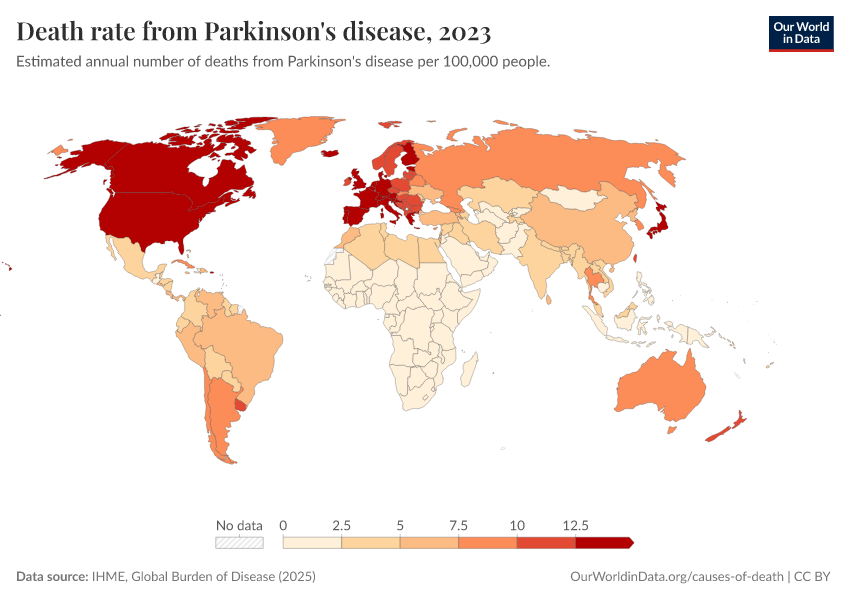 IHME, Global Burden of Disease (2025) – with major processing by Our World in Data. “Death rate from Parkinson's disease” [dataset]. IHME, Global Burden of Disease, “Global Burden of Disease - Deaths” [original data]. Retrieved February 23, 2026 from https://chart-preview-staging.owid.pages.dev:8789/20260211-174736/grapher/death-rate-from-parkinsons-disease-gbd.html (archived on February 11, 2026).