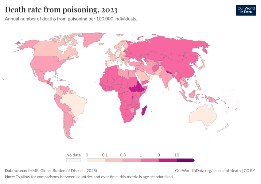 IHME, Global Burden of Disease (2025) – with major processing by Our World in Data. “Death rate from poisoning” [dataset]. IHME, Global Burden of Disease, “Global Burden of Disease - Deaths” [original data]. Retrieved February 23, 2026 from https://chart-preview-staging.owid.pages.dev:8789/20260211-174736/grapher/death-rate-from-poisoning.html (archived on February 11, 2026).