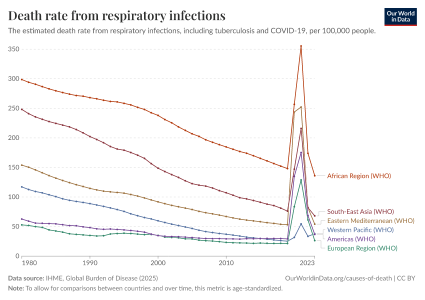 IHME, Global Burden of Disease (2025) – with major processing by Our World in Data. “Death rate from respiratory infections” [dataset]. IHME, Global Burden of Disease, “Global Burden of Disease - Deaths” [original data]. Retrieved February 23, 2026 from https://chart-preview-staging.owid.pages.dev:8789/20260211-174736/grapher/death-rate-from-respiratory-infections.html (archived on February 11, 2026).