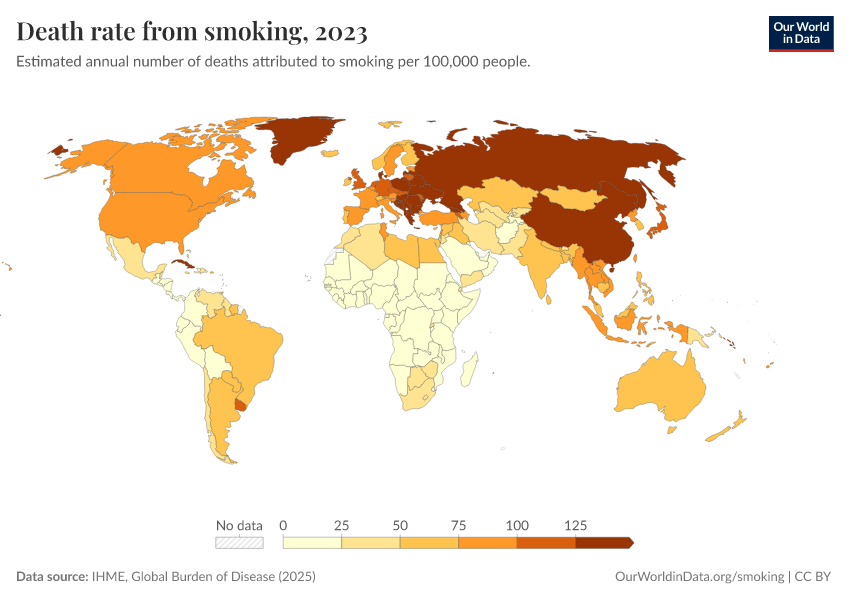 IHME, Global Burden of Disease (2025) – with major processing by Our World in Data. “Death rate from smoking” [dataset]. IHME, Global Burden of Disease, “Global Burden of Disease - Risk Factors - Deaths” [original data]. Retrieved February 23, 2026 from https://chart-preview-staging.owid.pages.dev:8789/20260213-113303/grapher/death-rate-from-smoking.html (archived on February 13, 2026).