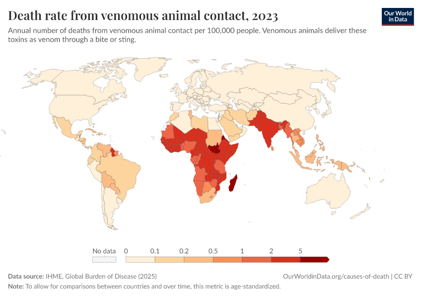 IHME, Global Burden of Disease (2025) – with major processing by Our World in Data. “Death rate from venomous animal contact” [dataset]. IHME, Global Burden of Disease, “Global Burden of Disease - Deaths” [original data]. Retrieved February 23, 2026 from https://chart-preview-staging.owid.pages.dev:8789/20260211-174736/grapher/death-rate-from-venomous-animal.html (archived on February 11, 2026).