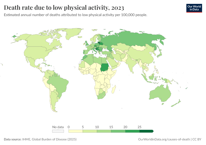 “Data Page: Death rate due to low physical activity”, part of the following publication: Esteban Ortiz-Ospina and Max Roser (2016) - “Global Health”. Data adapted from IHME, Global Burden of Disease. Retrieved from https://chart-preview-staging.owid.pages.dev:8789/20260213-112438/grapher/death-rates-due-to-low-physical-activity-gbd.html [online resource] (archived on February 13, 2026).How to cite this data