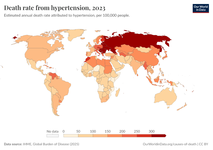 IHME, Global Burden of Disease (2025) – with major processing by Our World in Data. “Death rate from hypertension” [dataset]. IHME, Global Burden of Disease, “Global Burden of Disease - Risk Factors - Deaths” [original data]. Retrieved February 23, 2026 from https://chart-preview-staging.owid.pages.dev:8789/20260213-112438/grapher/death-rates-from-high-blood-pressure-gbd.html (archived on February 13, 2026).