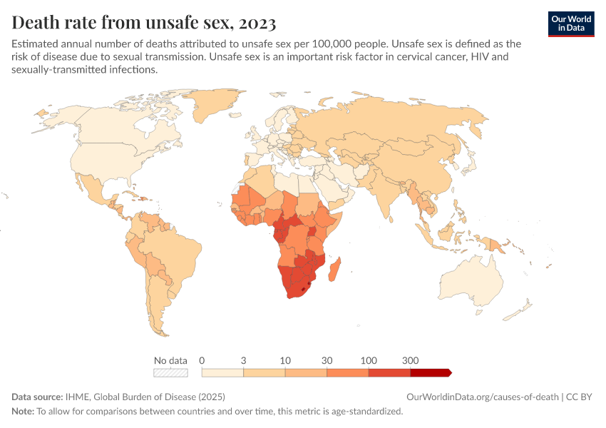 IHME, Global Burden of Disease (2025) – with major processing by Our World in Data. “Death rate from unsafe sex” [dataset]. IHME, Global Burden of Disease, “Global Burden of Disease - Risk Factors - Deaths” [original data]. Retrieved February 23, 2026 from https://chart-preview-staging.owid.pages.dev:8789/20260213-113303/grapher/death-rates-from-unsafe-sex.html (archived on February 13, 2026).